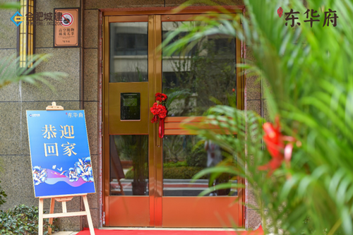 在交房現(xiàn)場,無論是“恭迎回家”的清涼水牌、還是入戶門上精心綁就的錦簇花團,一景一物,都以恭迎的姿態(tài),迎接東華府東苑的業(yè)主幸福歸家。