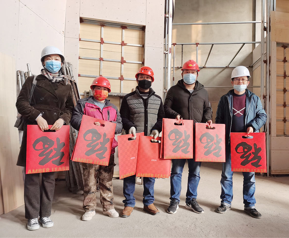 結(jié)束時(shí),田總還向現(xiàn)場(chǎng)工人贈(zèng)送了琥珀租賃定制的春聯(lián)禮包,并向大家致以新年祝福。